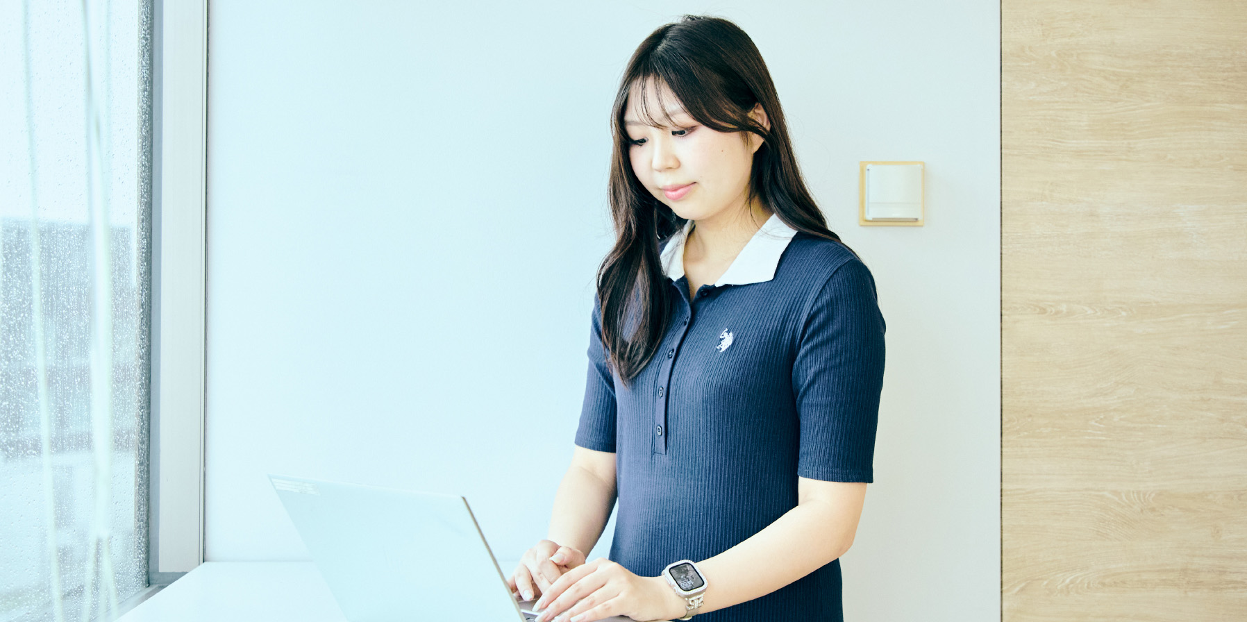 大学では、情報理学、心理学、社会学など幅広く学び、プログラミングやウェブ系のデザインにも取り組む。就職活動では、シイエヌエスのパンフレットに書かれた「超IT宣言」という挑戦的なスローガンに惹かれ、インターンシップに参加。先輩社員の明るい人柄や丁寧な対応に触れ、働くイメージを明確に持てたことで入社を決めた。また、自己啓発手当など社員の成長を応援する環境も決め手となった。