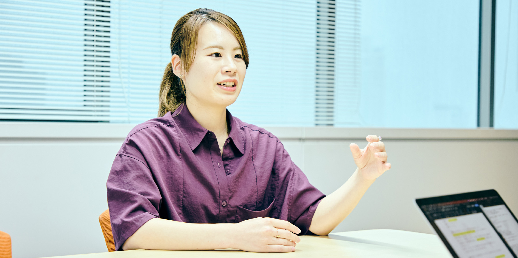 大学時代は応用化学科で生命寄りの研究に打ち込む傍ら、学内イベント運営など「周囲と協力して何かを成し遂げる」ことにやりがいを感じ、就職活動ではそれが実現できる企業を探す。その中で、両親がエンジニアだったことからIT企業を身近に感じ、シイエヌエスのインターンに参加。社員同士の交流の深さや風通しのよさに惹かれ、「この人たちと働きたい」と思えたことが入社の決め手となった。